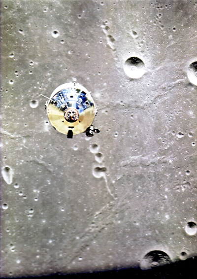 Los módulos de mando y servicio fotografiados desde el LEM poco después de desacoplarse para aterrizar en la luna. Credit: NASA.