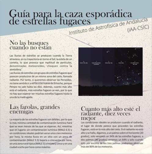 Se recomienda observar la lluvia de estrellas la noche del 12 al 13 de agosto, en la que se espera el pico de actividad. Se estima que habrá un máximo de unos cien meteoros por hora en condiciones perfectas de iluminación.
